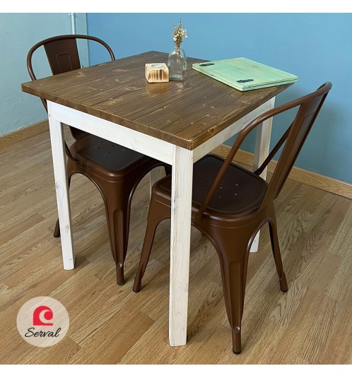 Questo è un tavolo adatto ad un uso quotidiano con un telaio e gambe in legno Di Abete con finitura cocco-vaniglia posizionate a 45° che lo rendono resistente e robusto.